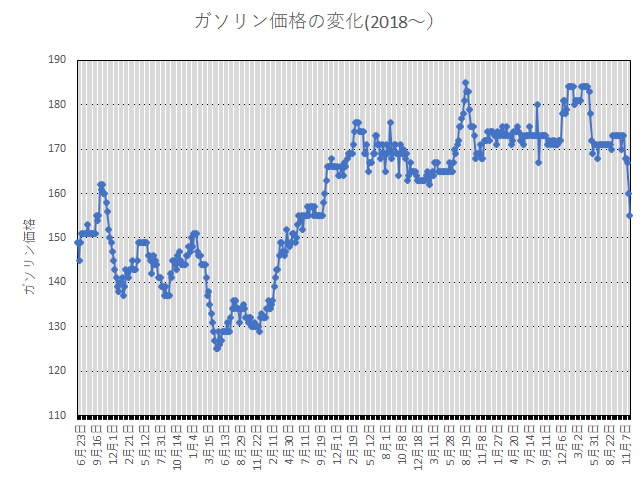 ガソリン価格はじわじわと上がってきています。このまま行くと160円になるかもしれません。昔の記録を見ると1Lが120円(ハイオク)という時もあったので、そこまでとは言いませんが、せめて140円くらいになるといいですが・・。