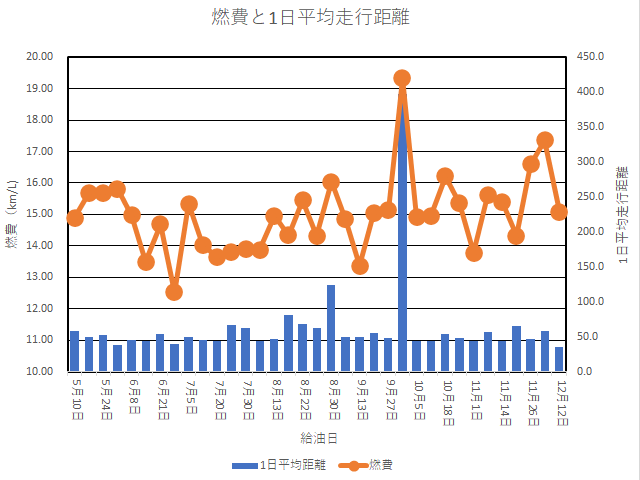 燃費は夏場はやはりエアコン使用であまりよくありません。気温が下がってきて、ちょっと燃費が良くなりました。ただ、タイヤをスタッドレスに替えたので、その影響はどうなることやら。相変わらず走行距離が多いです。